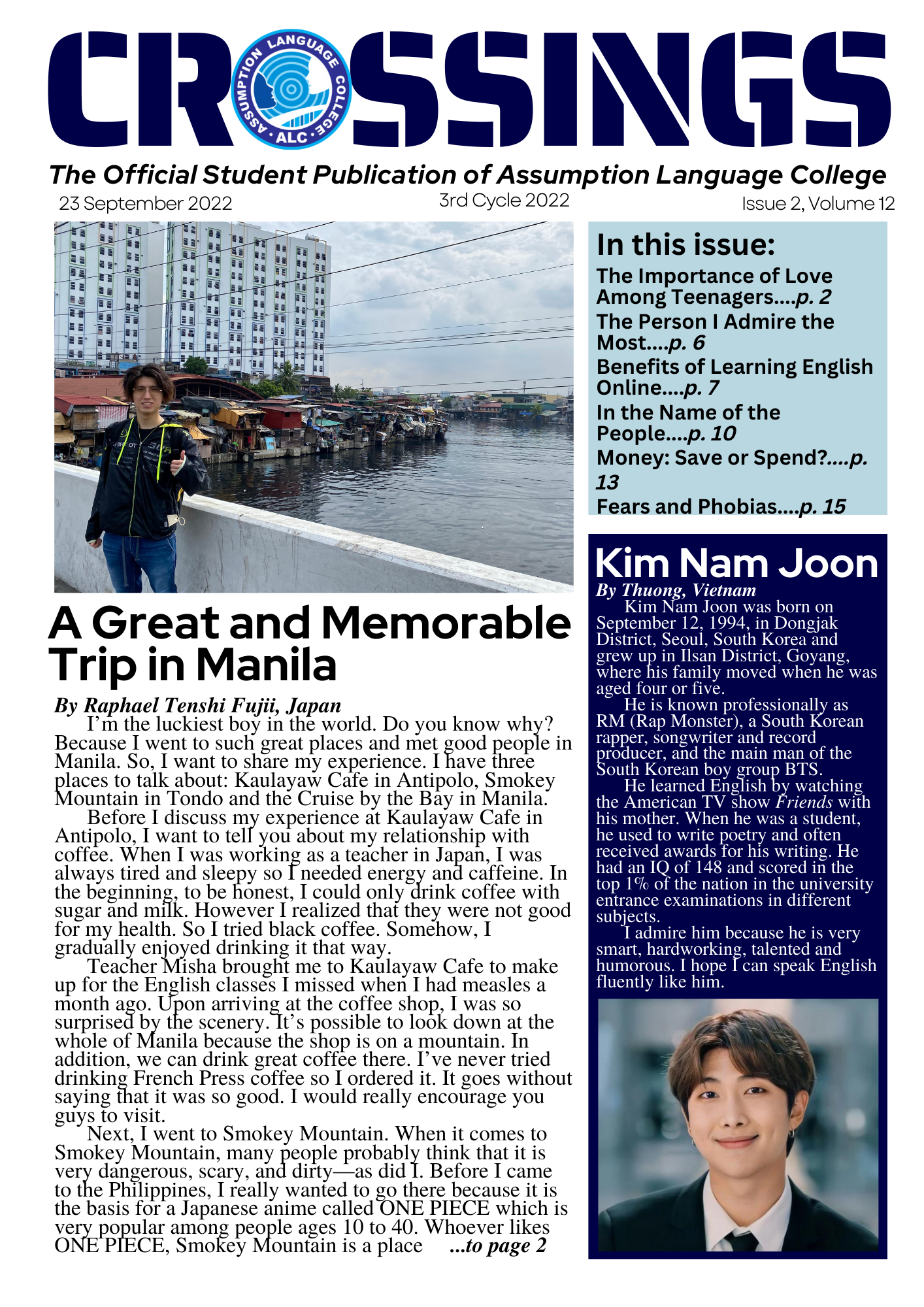 CROSSINGS is the official student publication of the learners at ALC. Here you will find samples of their written works (essays, poems, news articles and research work) that are parts of their requirements in their reading and writing classes. 27 September 2023 ALC 2 years ago Crossings-4th-Cycle-2022-1-1Download 11 July 2023 ALC 2 years ago Crossings-4th-Cycle-2022-1Download 09 February 2023 ALC 2 years ago 22 September 2022 ALC 3 years ago 13 July 2022 ALC 3 years ago 06 April 2022 ALC 3 years ago September 27, 2023 3rd Cycle 2023 July 11, 2023 Crossings-4th-Cycle-2022-1-1Download Crossings 4th Cycle February 9, 2023 Crossings-4th-Cycle-2022-1Download 4th Cycle 2022 September 22, 2022 3rd Cycle 2022 Load More